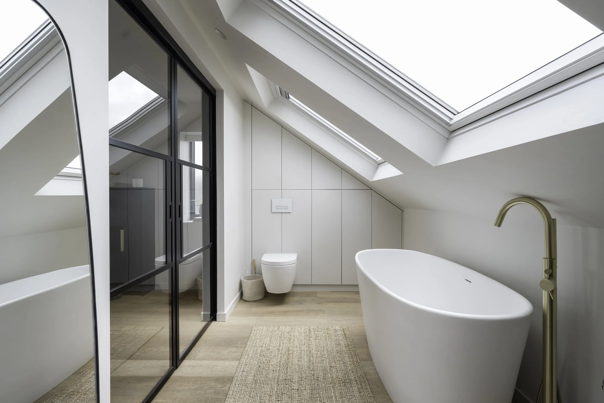 Bespoke fitted bathroom storage. Birch plywood carcasses finished in hard wax oil and painted doors with hidden push to open mechanism