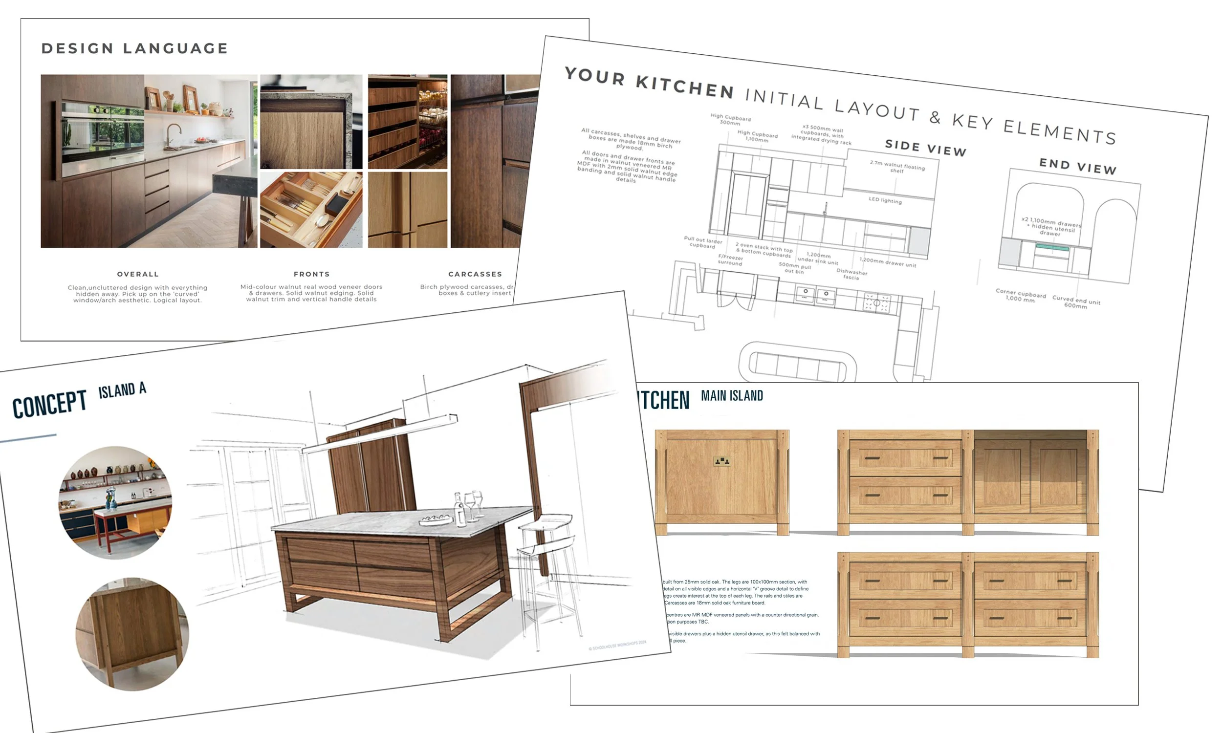 Pricing includes all carcassing in 18mm birch plywood, solid wood trim, doors, drawers, cover panels, ironmongery & internal fittings such as cutlery trays, and in cabinet lighting.