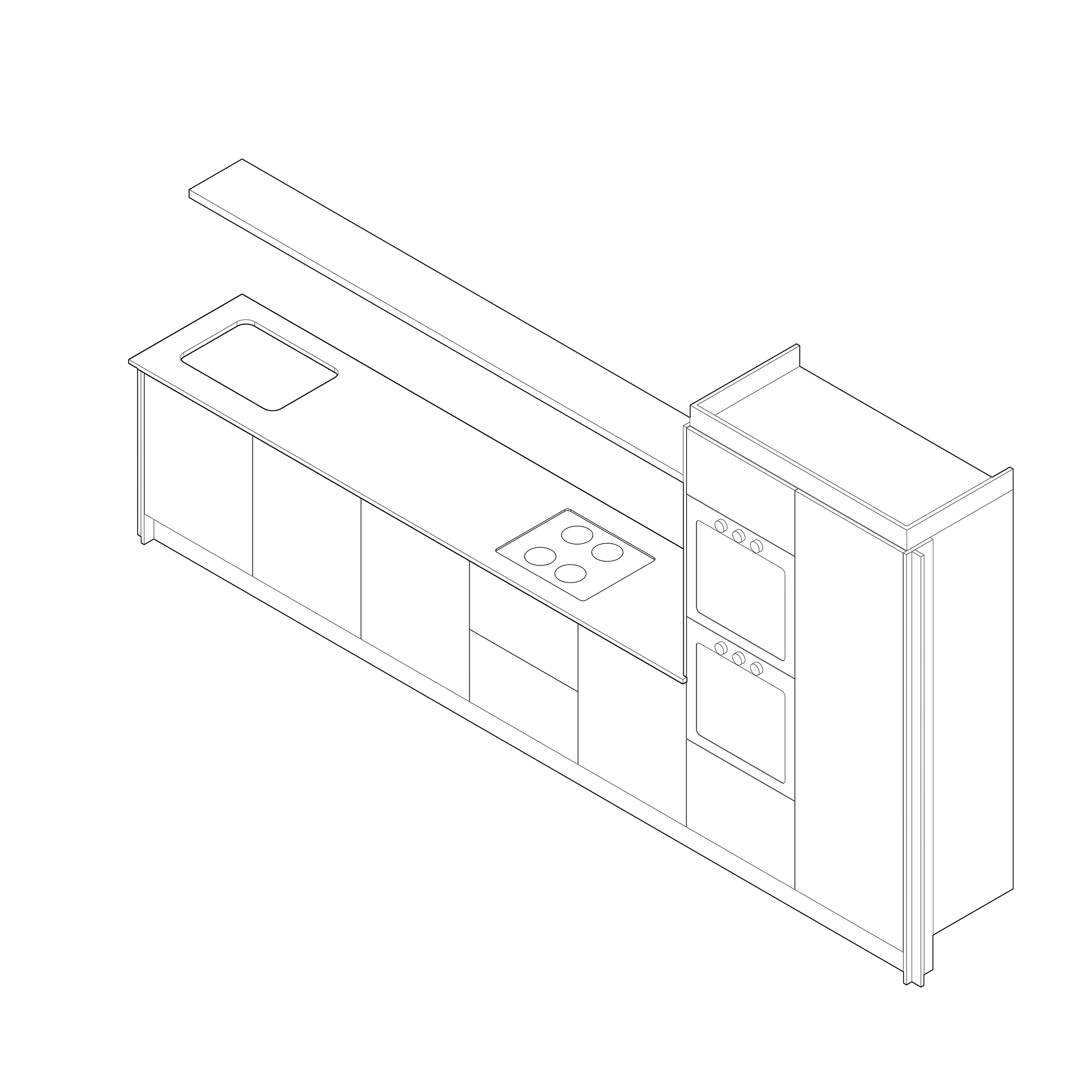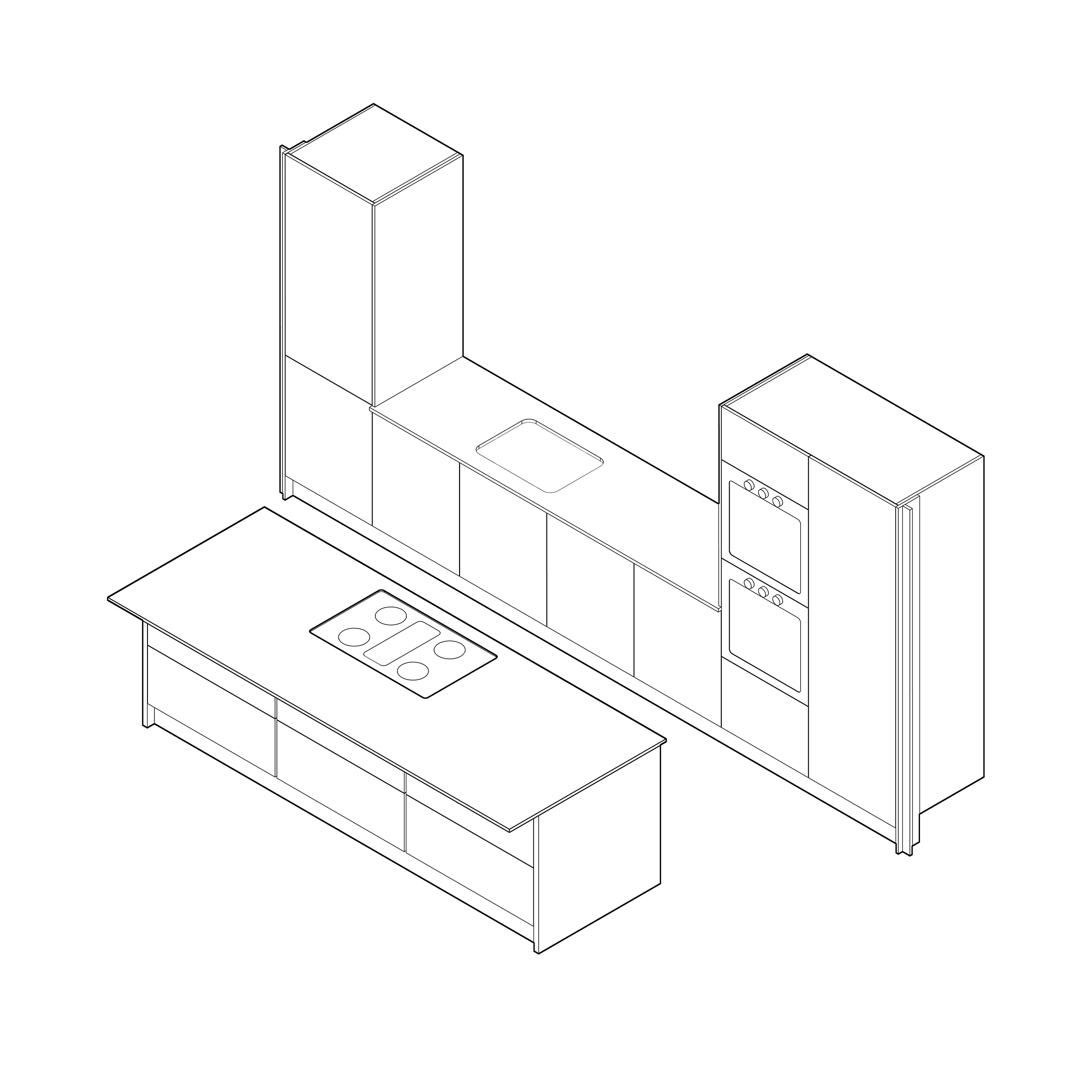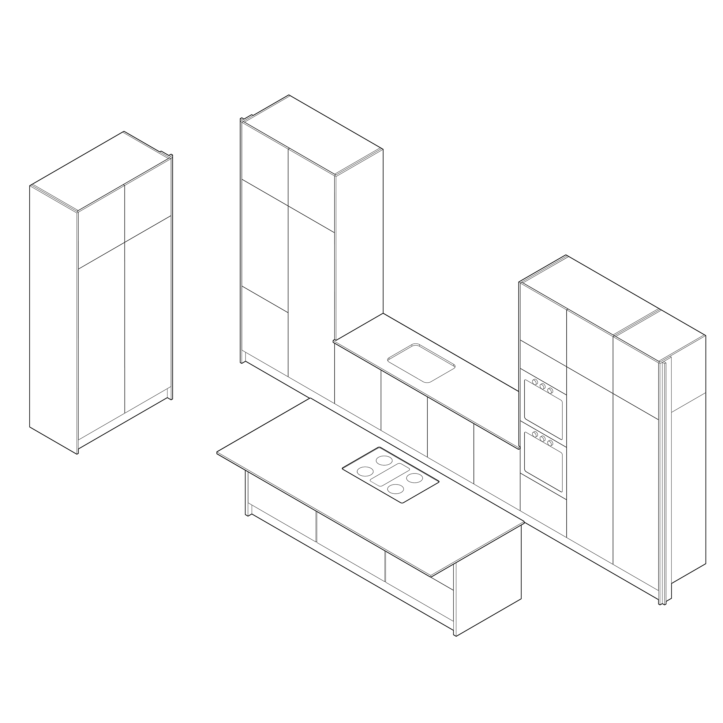 Example: full height sliding larder, double oven carcass with top and bottom cupboards, dishwasher facia, pull out bin, sink carcass and cupboard.